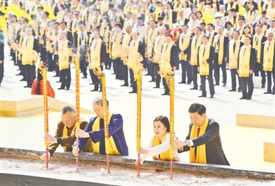祈福中华。拜祖台上,一幅波涛壮阔的黄河画卷徐徐展开。古小玉、何新、刘家强、符之冠、陆进、徐显明、孙达,中央统战部九局二级巡视员孙彦涛,国家文化和旅游部一级巡视员王鹤云,中国工程院院士、全国勘察设计大师何镜堂,中国工程院院士、第二届国医大师王琦,中国工程院院士、华东合成生物产业技术研究院负责人郑裕国,全国政协委员、北京大学教授张颐武,中国文联书记处原书记、中国电影家协会分党组原书记张宏,中国美术家协会分党组书记、中国美术家协会副主席马锋辉,中国戏剧家协会分党组书记、驻会副主席陈涌泉,中国食品药品企业质量安全促进会会长毛振宾,国学专家、讲席教授、北京中医药大学国学院创院院长张其成,知名学者、浙江大学求是特聘教授郑强,资深媒体专家胡锡进,中欧经济文化研究发展中心会长柯海啸,中国男高音歌唱家、河南音乐学院院长戴玉强,河南邓亚萍体育产业投资基金董事长邓亚萍,全国政协委员、知名作家蒋胜男,首届岐黄学者、河南中医药大学校长王耀献,全国人大代表、依文集团董事长夏华,同仁堂集团董事长王贵平,香港中资基金业协会会长连少冬,中铁工程装备集团有限公司董事长赵华,国家级非物质文化遗产石雕项目代表性传承人刘红立,在画卷上盖印,以黄河为证,祝福国家安泰、海宇宁谧。